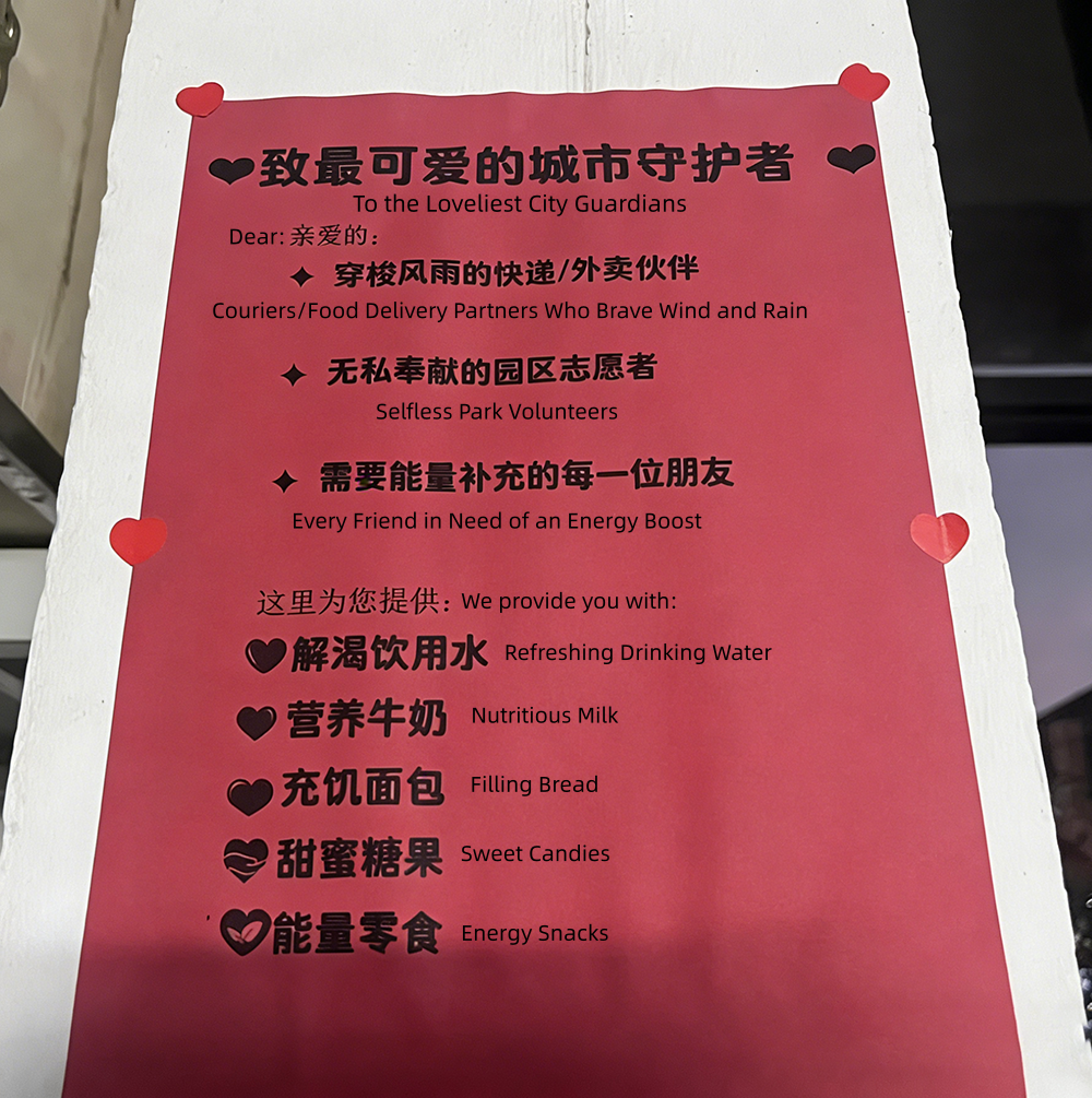 On April 20, 2025, the Peninsula Caring Supply Station was officially launched at the Peninsula 1919 Creative Park. Located beside the 5B entrance of Building No.5, right outside the Sinooutput office, this small yet welcoming station is open year-round to serve outdoor workers with warmth, care, and practical support.